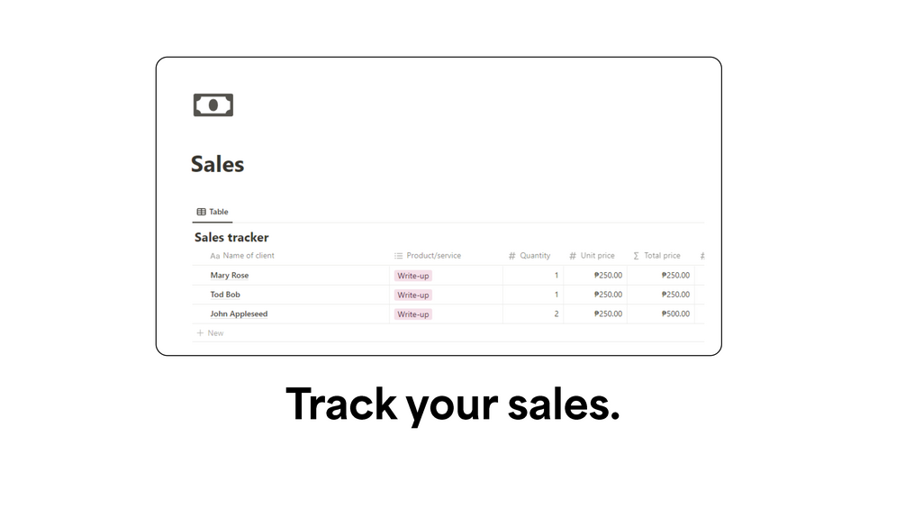 We readied a sales tracker just for you - and guess what? You don't have to add up the total price and each client's outstanding balance yourself: we did it for you. Take a deep breath and relax, because we got it covered.